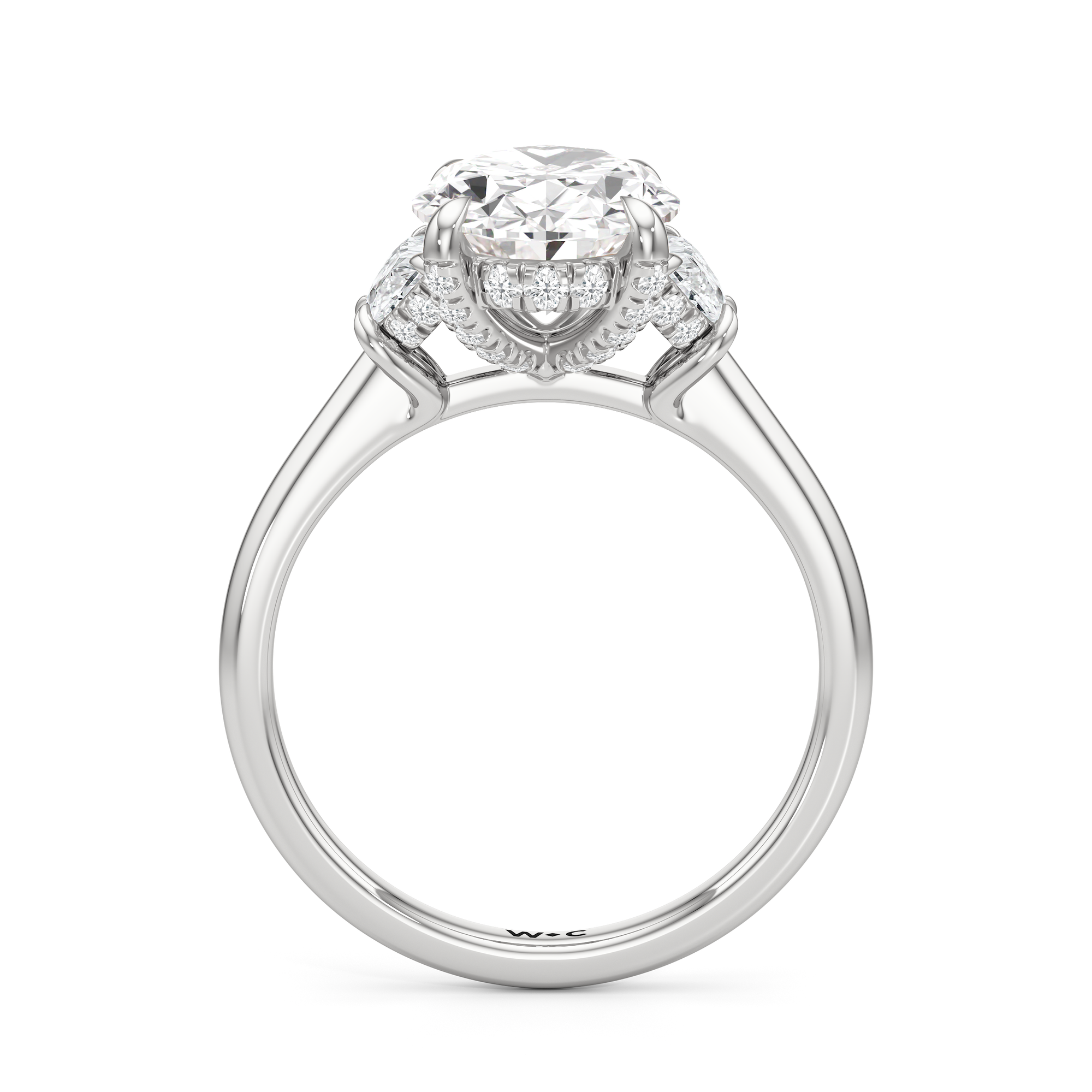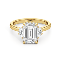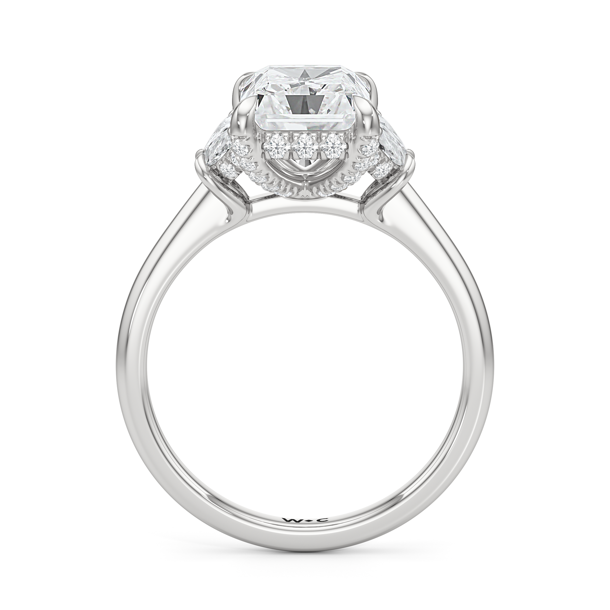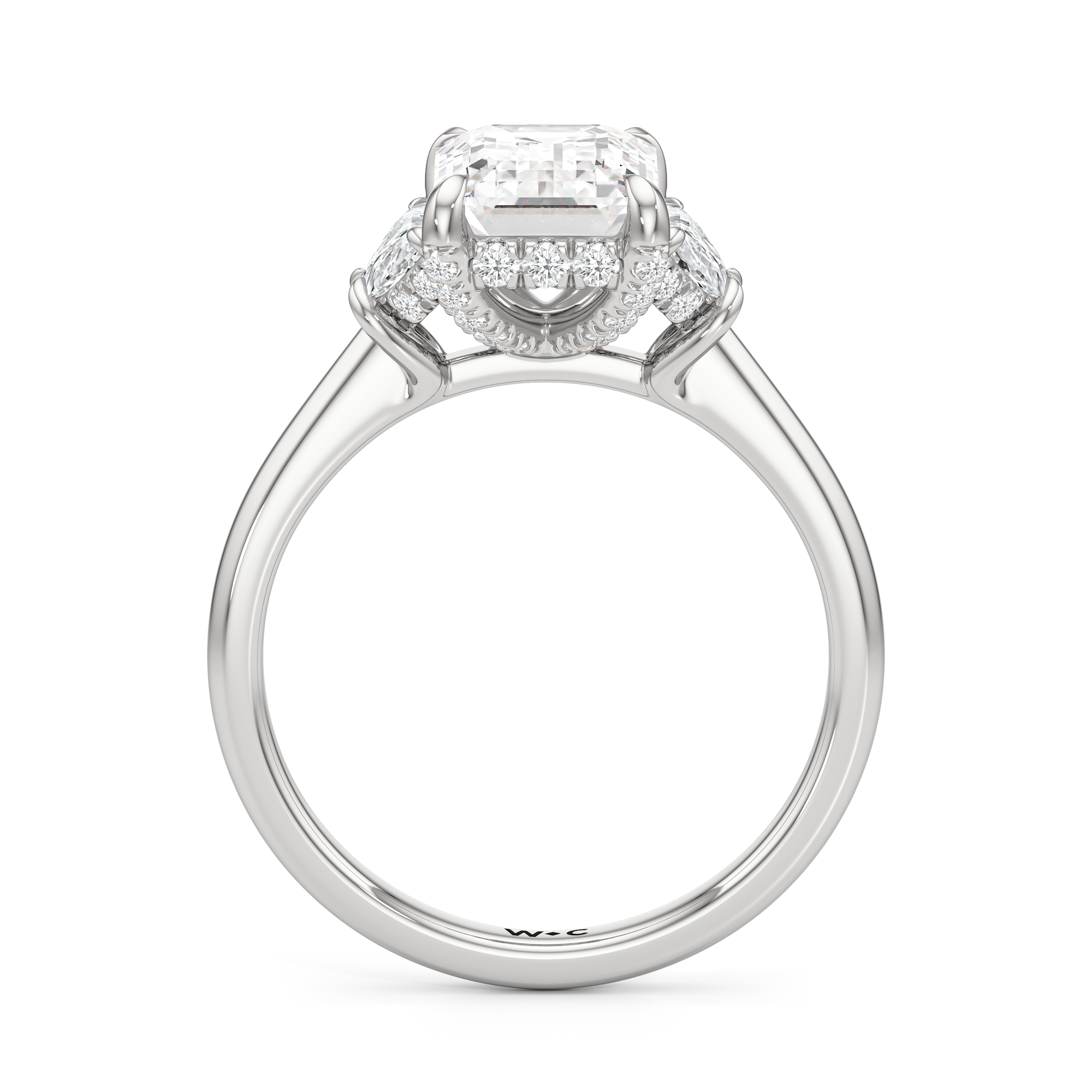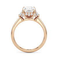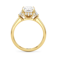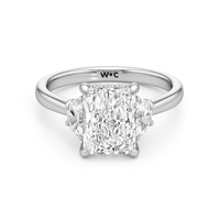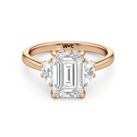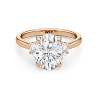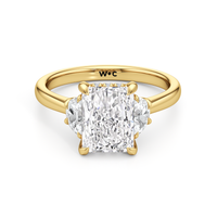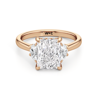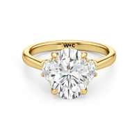 Gracefully adorned with half-moon side diamonds, this ring exudes a soft, sculptural elegance that complements its refined silhouette. The curved facets of the side stones create a fluid play of light, adding depth and a gentle brilliance.