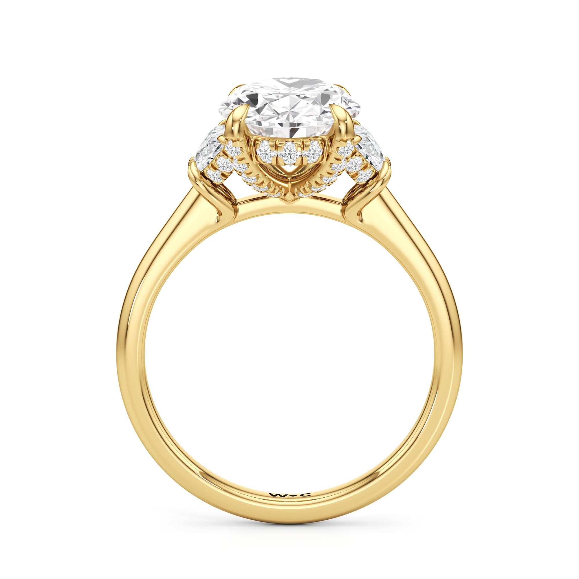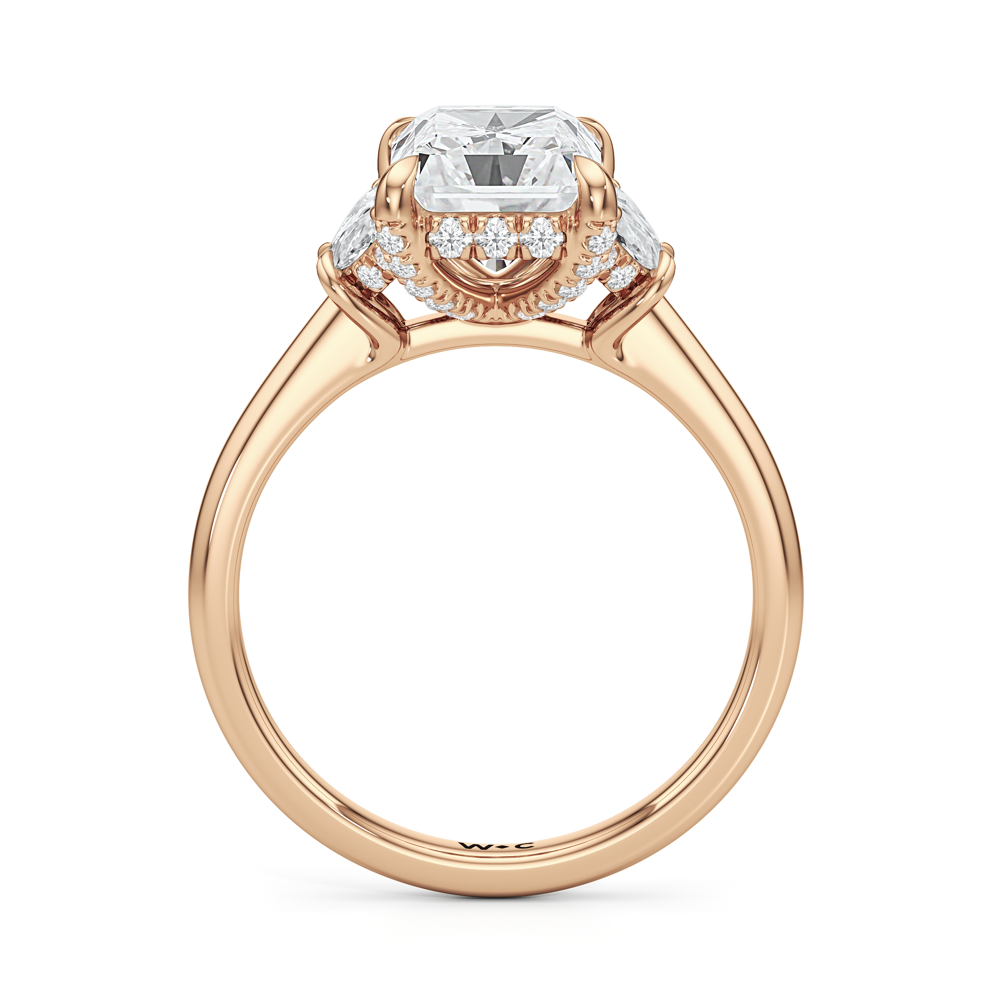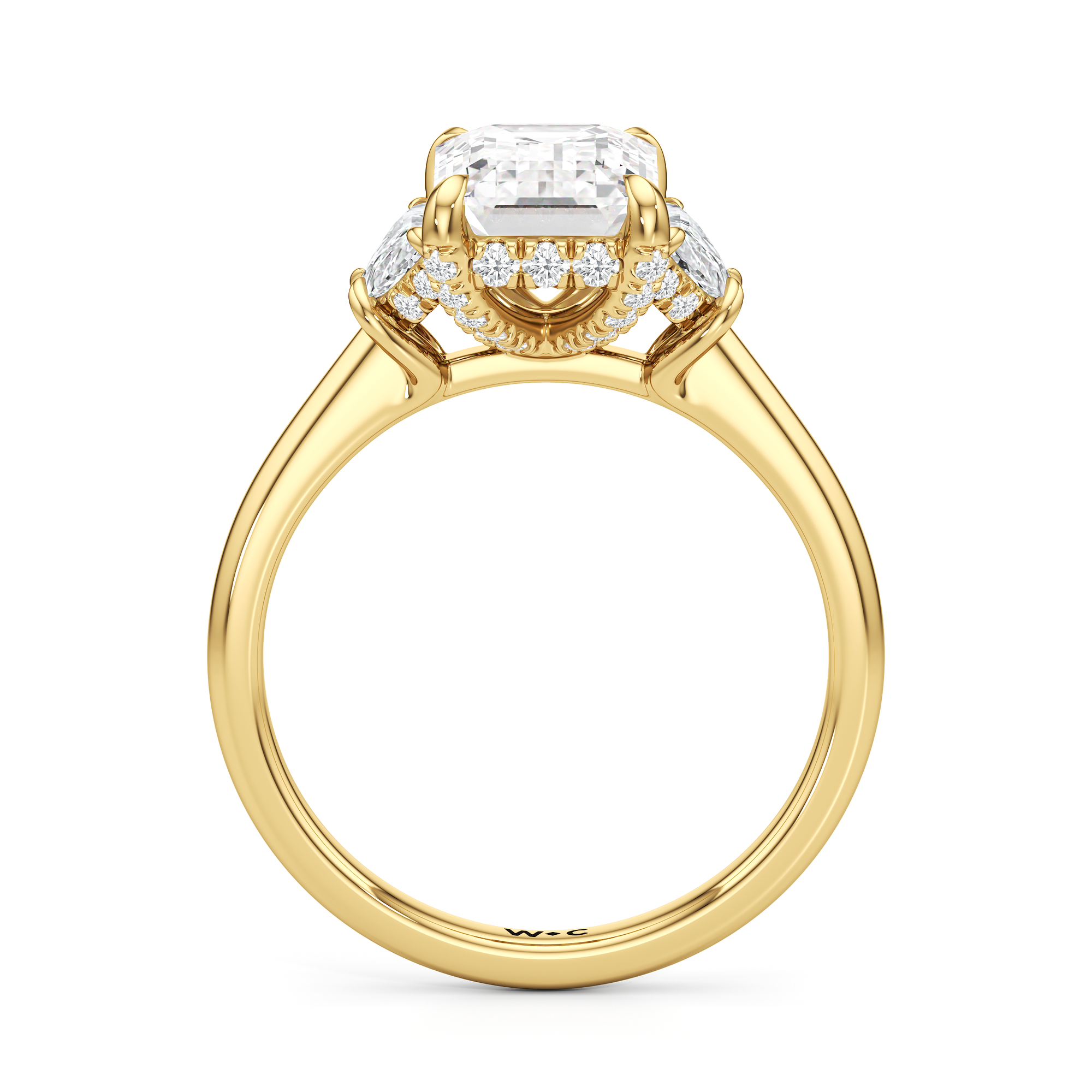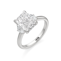 Gracefully adorned with half-moon side diamonds, this ring exudes a soft, sculptural elegance that complements its refined silhouette. The curved facets of the side stones create a fluid play of light, adding depth and a gentle brilliance.