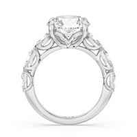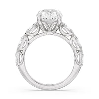 This engagement ring is unforgettably romantic. Marquise-cut diamonds are set in V-shaped prongs along the band, creating a delicate and refined appeal. The center diamond is showcased on claw prongs, enhancing the diamond. The v-shaped gallery provides a unique flair, making for an elegant finish.