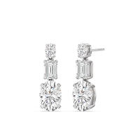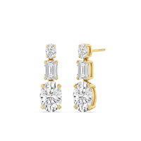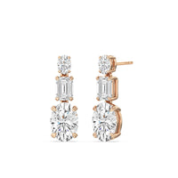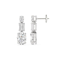 These diamond drop earrings exude both an air of sophistication and playfulness. They feature a trio of sparklers: an oval diamond on a post, an emerald-cut middle diamond, and a bigger oval diamond drop. All gemstones are mounted securely on four-prong baskets. With a length that's just right, these drop earrings can add a delicate layer and a chic touch to your ensembles.