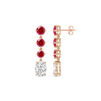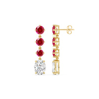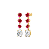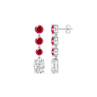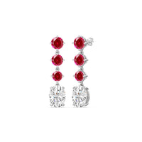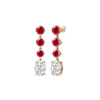 These diamond danglers exude a sense of sophistication and ease. They look relaxed and refined at once with their linear design and subtle movement. Each earring features a trio of round created ruby set in a vertical row and punctuated by a larger oval-cut diamond at the end. This elegant pair is the perfect choice when you want to dress to impress yet still be comfortable.