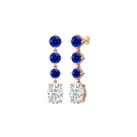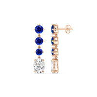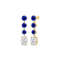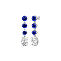 These diamond danglers exude a sense of sophistication and ease. They look relaxed and refined at once with their linear design and subtle movement. Each earring features a trio of round created sapphire set in a vertical row and punctuated by a larger oval-cut diamond at the end. This elegant pair is the perfect choice when you want to dress to impress yet still be comfortable.