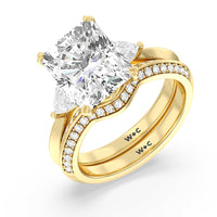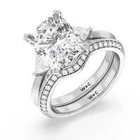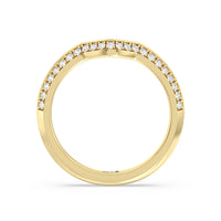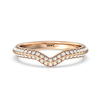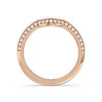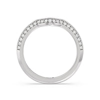 This curved diamond set wedding band is perfectly contoured to complement our side trillion diamond with knife edge elegance engagement ring for a simple and sophisticated look.