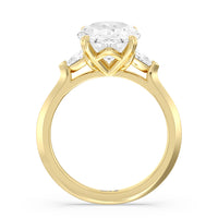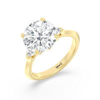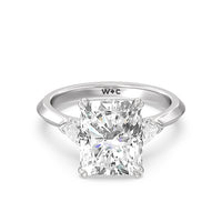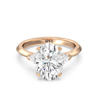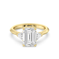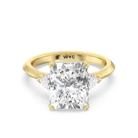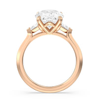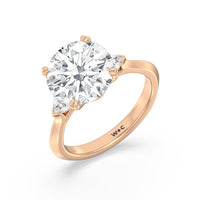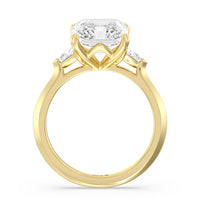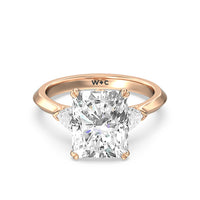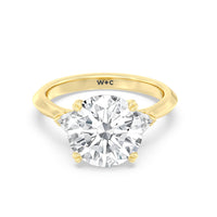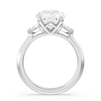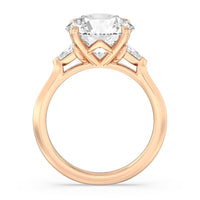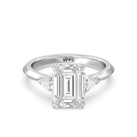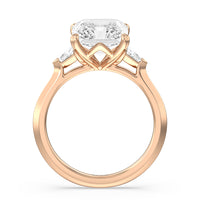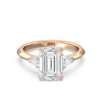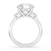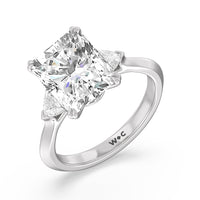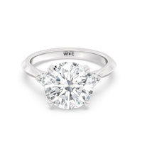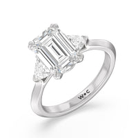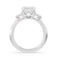 Quietly elegant, this three stone engagement ring boasts a sleek and chic profile. The polished knife-edge shank enhances its modern appeal, while the center diamond is flanked by dazzling trillion side stones for a balanced yet bold look. Securing the stones are double claw heart prongs, adding a touch of romance. An inverted V in the basket provides architectural detail, elevating the design and making it a luxury engagement ring that blends contemporary refinement with understated sophistication.