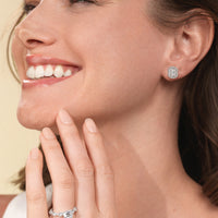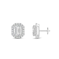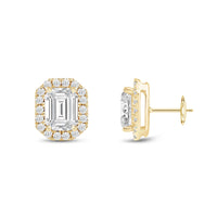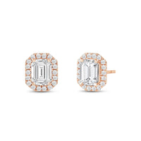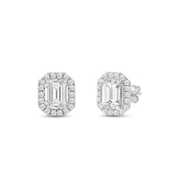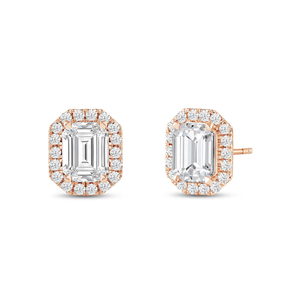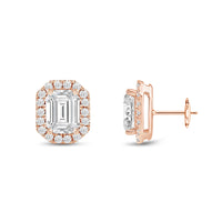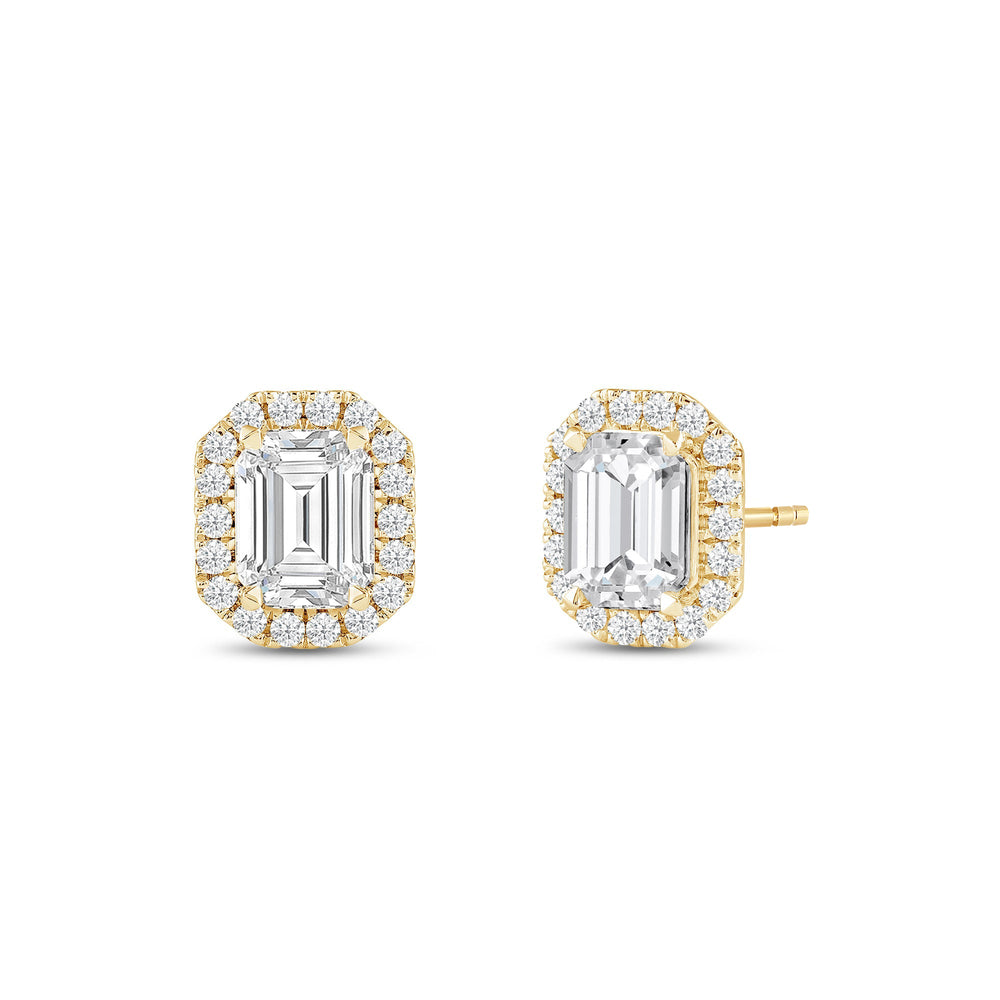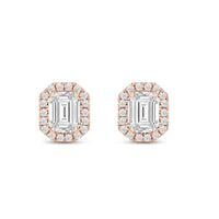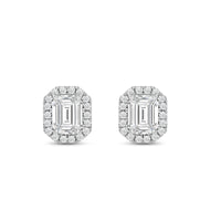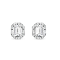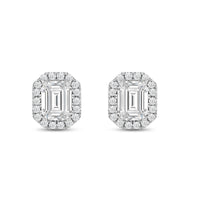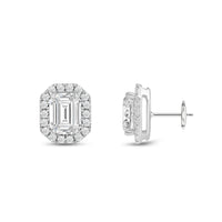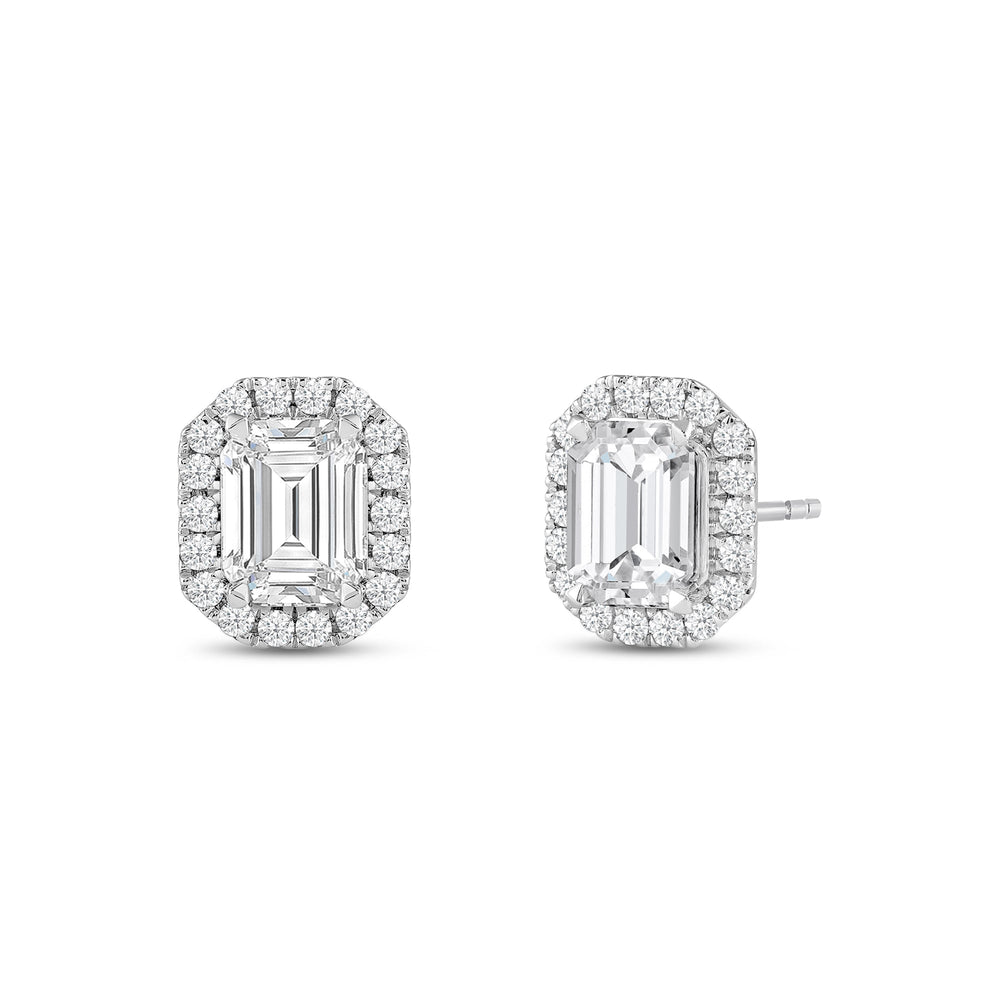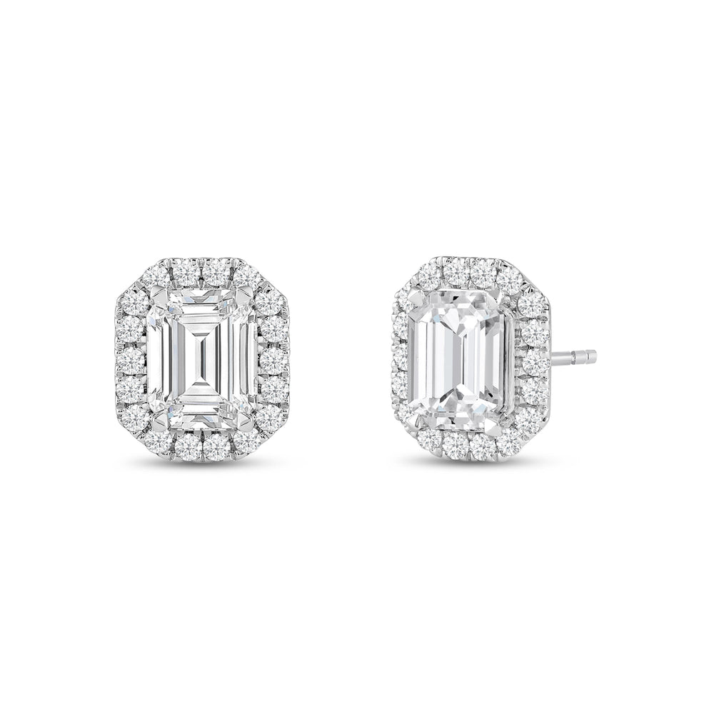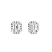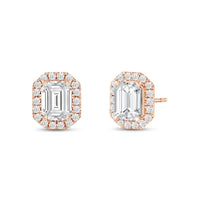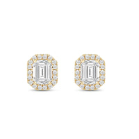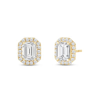 These diamond halo earrings are perfect for dressing up daytime or nighttime looks. Classic Emerald cut earrings with a stunning halo of round stones encircling the center stone.