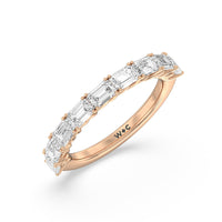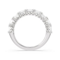 This ring looks modest and refined yet has a charming, unexpected twist. The slim band has its upper half traced with nine emerald-cut diamonds. Each diamond is secured by a four-prong U-shaped basket that intertwines with a wavy bridge.