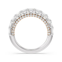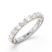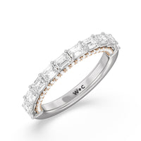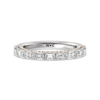 A lovely ring to mark a milestone in the life you've built together. This diamond anniversary band beams a brilliant shine that is as epic as your love story. The two-toned band features an outer shank with emerald-cut stones set on U-shaped prongs tracing half of the ring's circumference. Just beneath it is an arch gallery with round diamonds radiating a captivating sparkle.