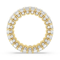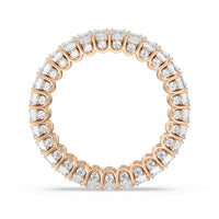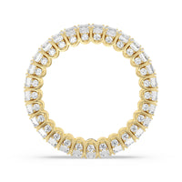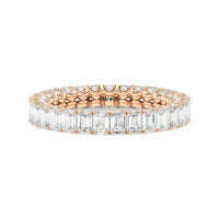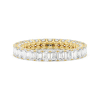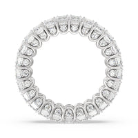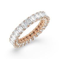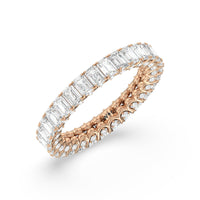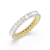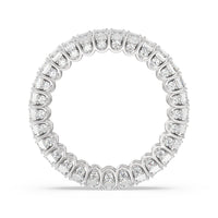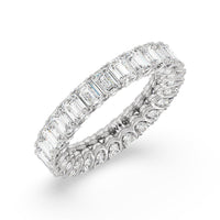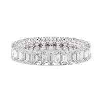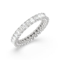 A ring of infinite sparkle. This eternity band in white gold features U-shaped split prong baskets securing brilliant Emerald diamonds. A scalloped profile forms on the inside of the ring and delivers a unique look. More petite round diamonds punctuate each U-shaped curve of each prong for brilliance that shine at any angle.