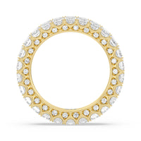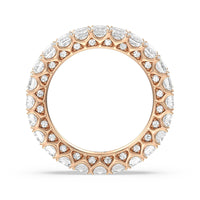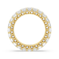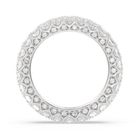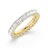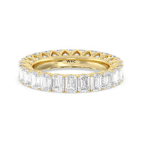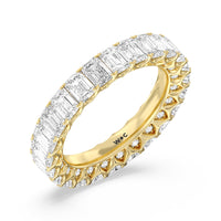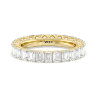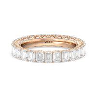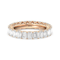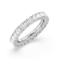 A bold yet dainty eternity ring to crown one's finger with maximum brilliance. This white gold piece features Emerald diamonds on decorative split prongs that stem from a high-polish inner shank. The spaces in between the slightly raised prongs are studded with petite round diamonds for a seamless shine.