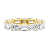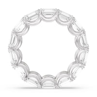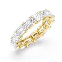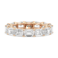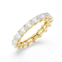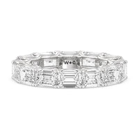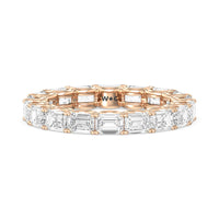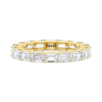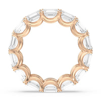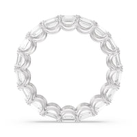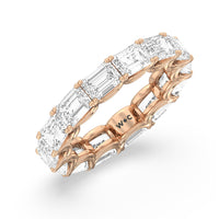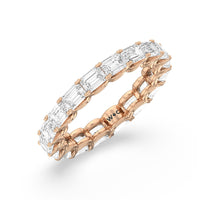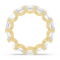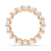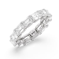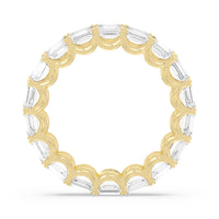 Radiating regal elegance, this eternity band is sure to wow anyone who looks at it. The ring features emerald-cut diamonds set on a loop of U-shaped prongs that form a wavy or scalloped profile. The diamond's curved setting not only allows more light to pass through for maximum brilliance but also gives the ring a graceful finish.
