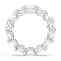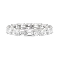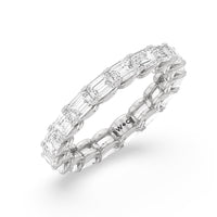 Radiating regal elegance, this eternity band is sure to wow anyone who looks at it. The ring features emerald-cut diamonds set on a loop of U-shaped prongs that form a wavy or scalloped profile. The diamond's curved setting not only allows more light to pass through for maximum brilliance but also gives the ring a graceful finish.