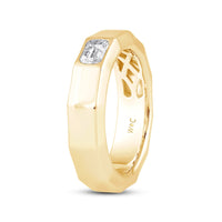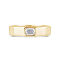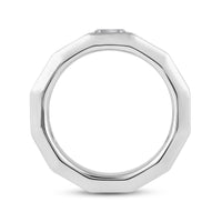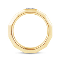A sculptural band with the perfect mix of masculinity and subtlety. This engagement ring for men features a faceted shank that can reflect both the different facets of love, and of the wearer's personality. The ring is topped with a solitary diamond securely held in place by a modern and durable bezel setting.