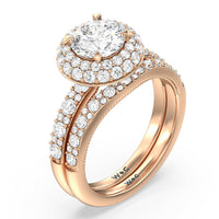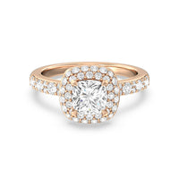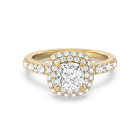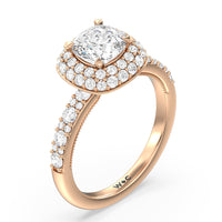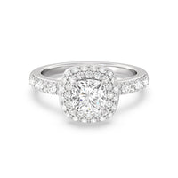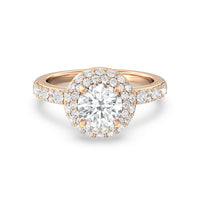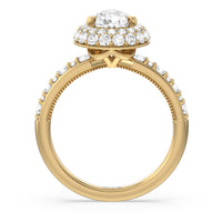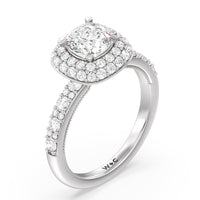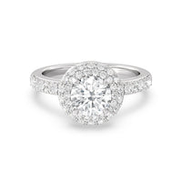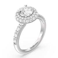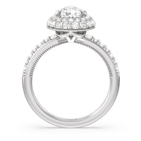 The pave falls over the edge of this unique diamond halo engagement ring to create an impressive multi-dimensional sparkle.