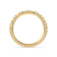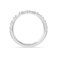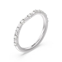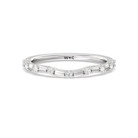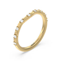 This curved diamond set wedding band is perfectly contoured to complement our fancy pave halo engagement ring for a simple and sophisticated look.