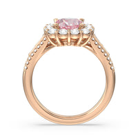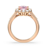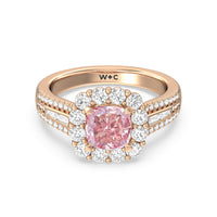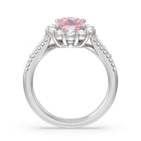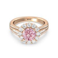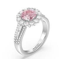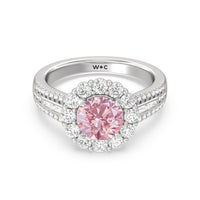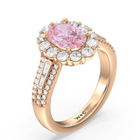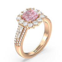 A mesmerizing ring embodying a dream come true. Let her know she is the one through this engagement ring. The high-polished tapered band features a slimmer shank that widens as its leads up to the diamond center stone with a floral halo. The shoulders come with three rows of round diamonds, with pairs of baguette-cut diamond accent stones for immense sparkle.