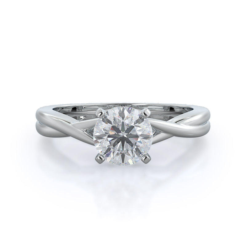 A traditional cathedral head cradles the diamond of the ring to let more light hit and accentuate the diamond. The twisting band adds another element of style.