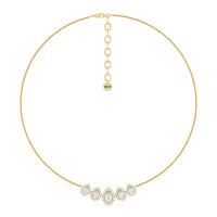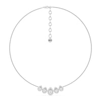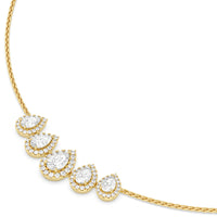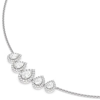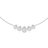 Looking for an effortless way to spice up your everyday looks? Wear this diamond necklace. This piece features a chain necklace adorned with a series of five pear-cut diamonds. At the center is a larger pear-cut diamond flanked by pairs of tapering pear diamonds. All five pear-cut stones are framed by a halo of petite round diamonds for added sparkle.