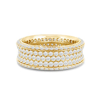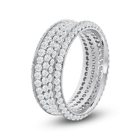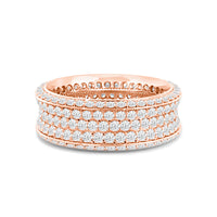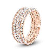 This ring makes an indisputably gorgeous symbol of your eternal promise of commitment. The wide band is set completely with round diamonds. Three glittering rows of diamonds cover the concave surface of the ring. The band's raised edges are also traced with diamonds. With a total of five rows of diamonds, this piece is guaranteed to impress, and clearly express your endless love.