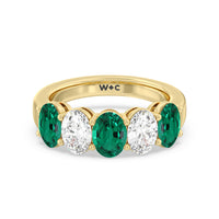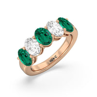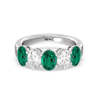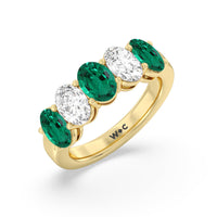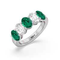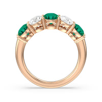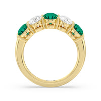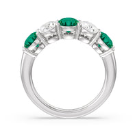 One simply can't deny the wow factor of this five-stone anniversary ring. It features a beautifully polished band set with alternate five round created Emerald and diamond on secure shared-prong baskets. The beauty and brilliance of this ring are perfect for honoring five years of marriage, your family of five, or the five pillars of your strong and healthy relationship.