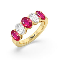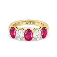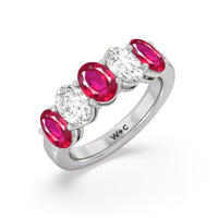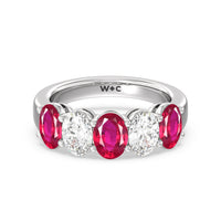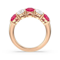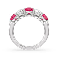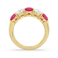 One simply can't deny the wow factor of this five-stone anniversary ring. It features a beautifully polished band set with alternate five round created Ruby and diamond on secure shared-prong baskets. The beauty and brilliance of this ring are perfect for honoring five years of marriage, your family of five, or the five pillars of your strong and healthy relationship.