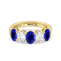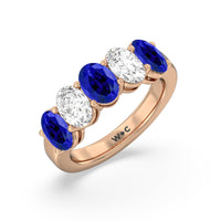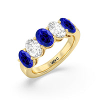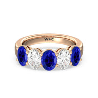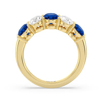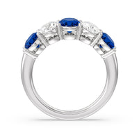 One simply can't deny the wow factor of this five-stone anniversary ring. It features a beautifully polished band set with alternate five round created sapphire and diamond on secure shared-prong baskets. The beauty and brilliance of this ring are perfect for honoring five years of marriage, your family of five, or the five pillars of your strong and healthy relationship.