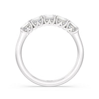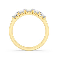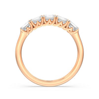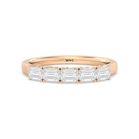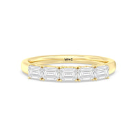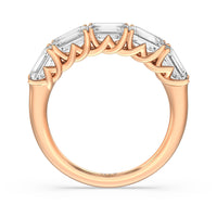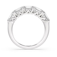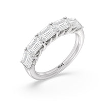 This ring looks modest and refined yet has a charming, unexpected twist. The slim band has its upper half traced with nine emerald-cut diamonds. Each diamond is secured by a four-prong U-shaped basket that intertwines with a wavy bridge.