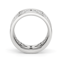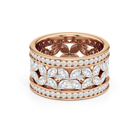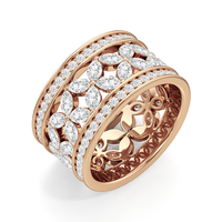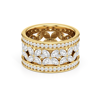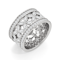 The Wildflower Eternity Ring turns heads. This wide-band diamond ring is sure to captivate all who behold it with its feminine and romantic look. The band's edges are traced with petite round diamonds, sandwiching a row of four-petaled blooms, each detailed with a quartet of marquise diamonds. The ring offers a ton of finger coverage and a presence that lingers and endures.