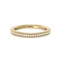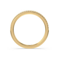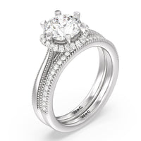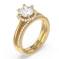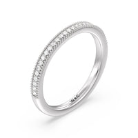 This curved diamond set wedding band is perfectly contoured to complement our floral halo cathedral engagement ring for a simple and sophisticated look.