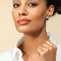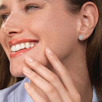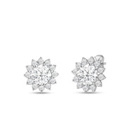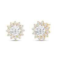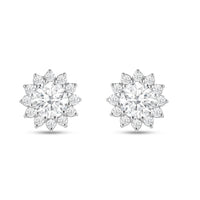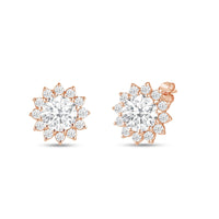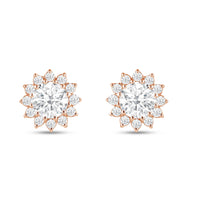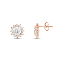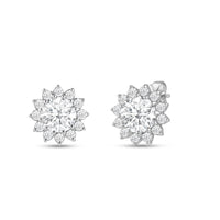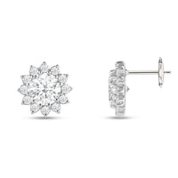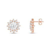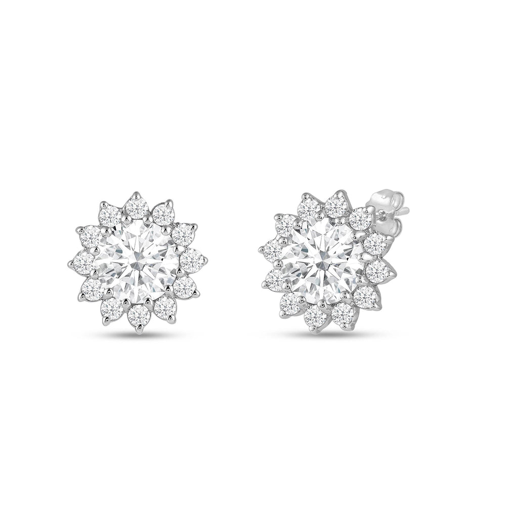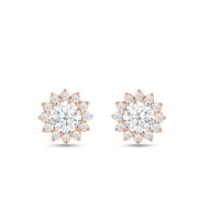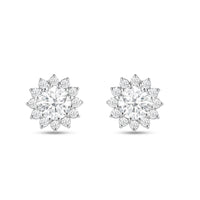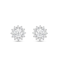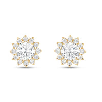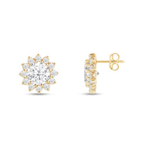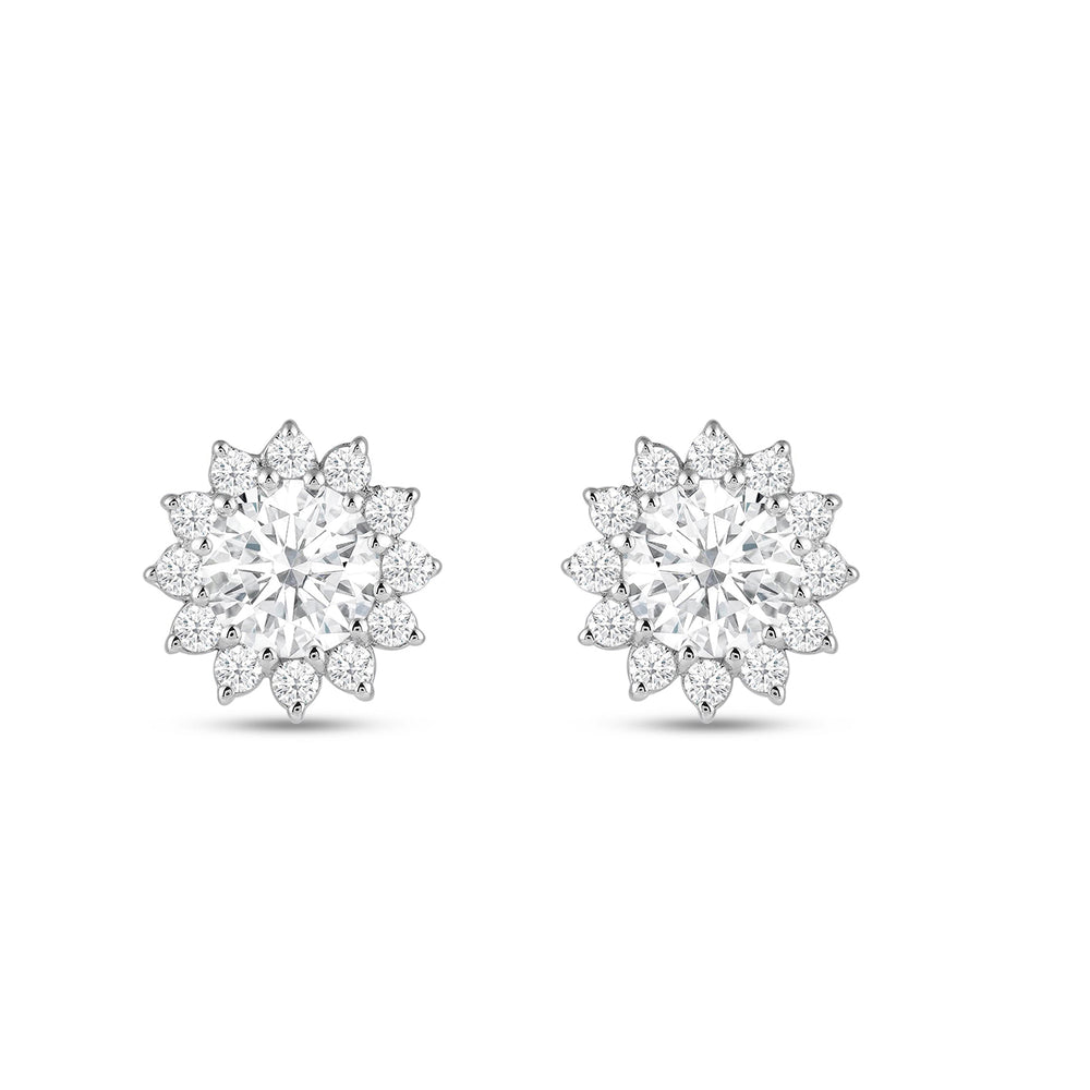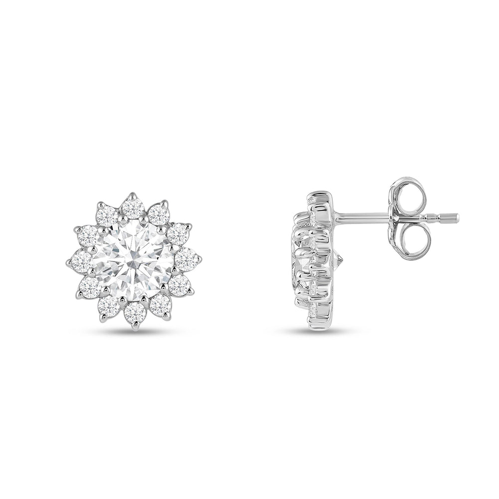 Classic round cut earrings with a stunning floral halo of round stones encircling the center stone.A lovely outfit-maker, this pair of stud earrings is what you need to give any ensemble a polished, put-together finish.