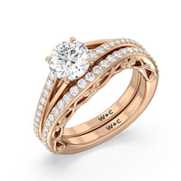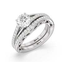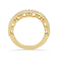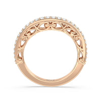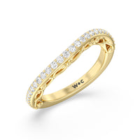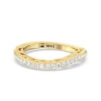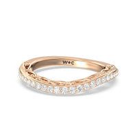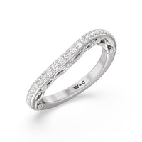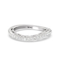 This curved diamond set wedding band is perfectly contoured to complement our galleria vintage filigree engagement ring for a simple and sophisticated look.