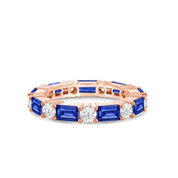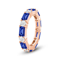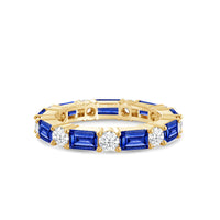 This eternity band is all about modern, edgy elegance. The continuous row of diamonds features alternating created sapphire baguette and round diamonds secured by prongs. The beautiful pattern and textured sides give this ring a touch of offbeat flair.