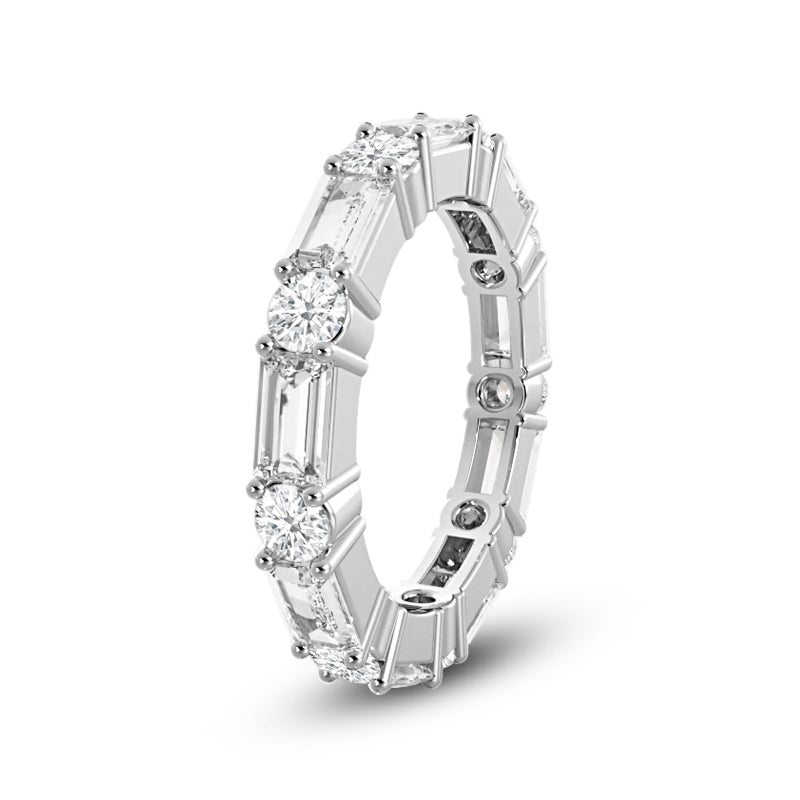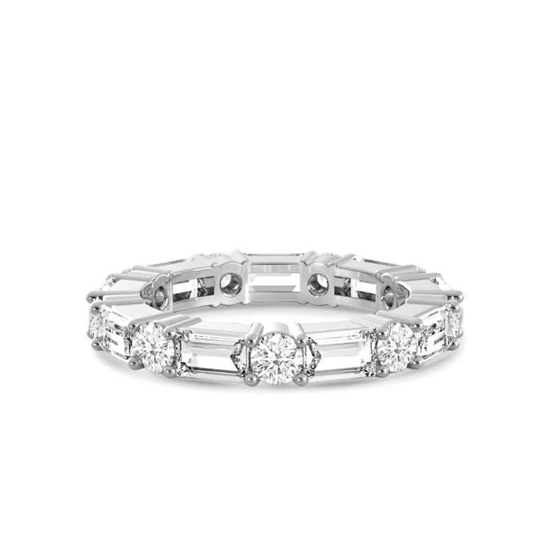This eternity band is all about modern, edgy elegance. The continuous row of diamonds features alternating baguette and round diamonds secured by prongs. The beautiful pattern and textured sides give this ring a touch of offbeat flair.