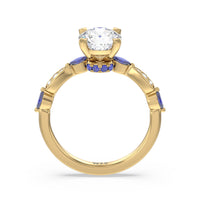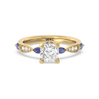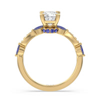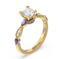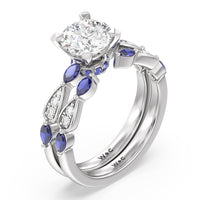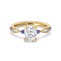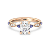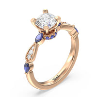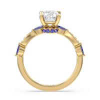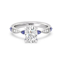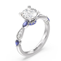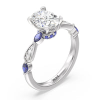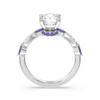 This engagement ring is inspired by the Gerbera flower petals with its striking marquise created blue sapphire. The created blue sapphire under-halo adds that little extra to make this your must-have engagement ring.