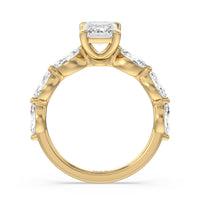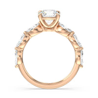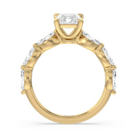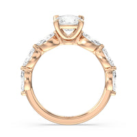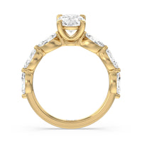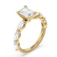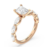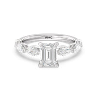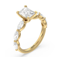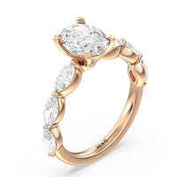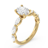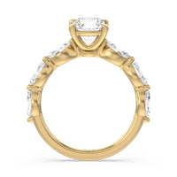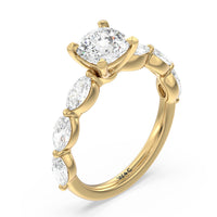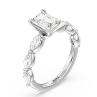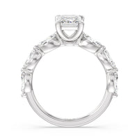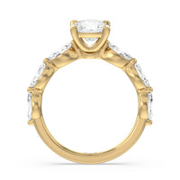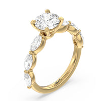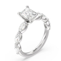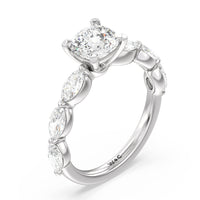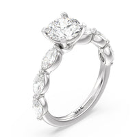 A solitaire that's showy in brilliance yet sophisticated in style. This diamond engagement ring features a captivating central gem in a kite basket. Giving the center stone an extra compelling look are glittering scalloped shoulders that elegantly hold the marquise side stones.
