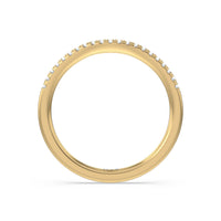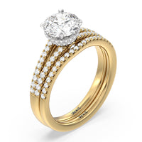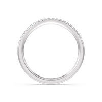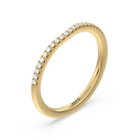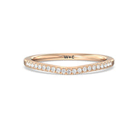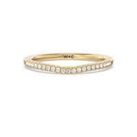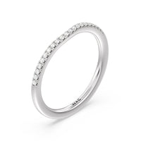 This curved diamond set wedding band is perfectly contoured to complement our grand hidden halo engagement ring for a simple and sophisticated look.