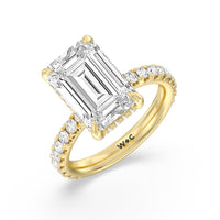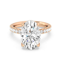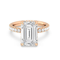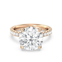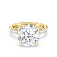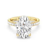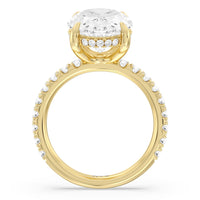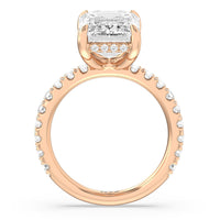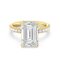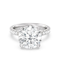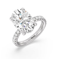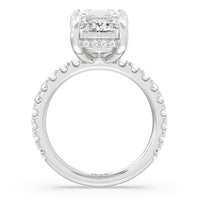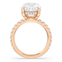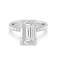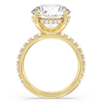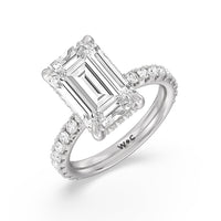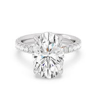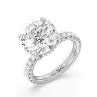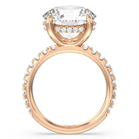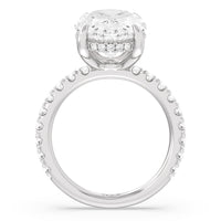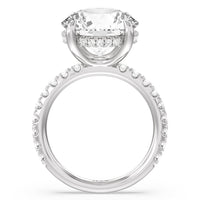 The perfect choice when you're looking for something really classic but utterly opulent. This engagement ring features a mesmerizing 7-carat diamond for its centerstone. It sits securely on a U-shaped prong setting atop a slim band that's almost fully covered with more diamonds. A hidden halo adds an extra wow factor to this ring.