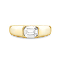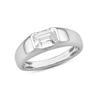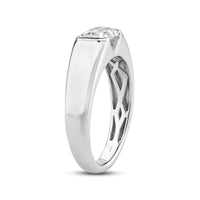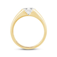 An ultra-modern engagement ring for the man who isn't afraid to go outside the norm. This piece features a bevel-edged shank that broadens toward the center stone. A half-bezel setting with a decorative v-shaped indentation cradles the central solitary diamond.