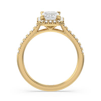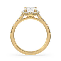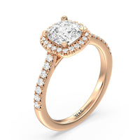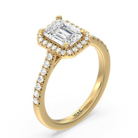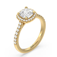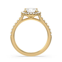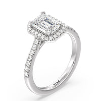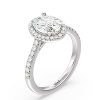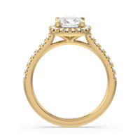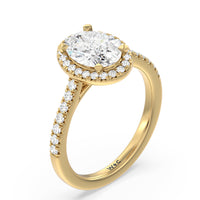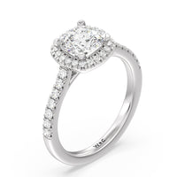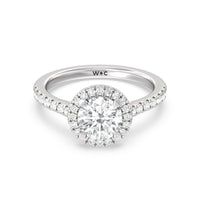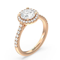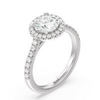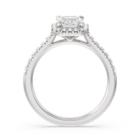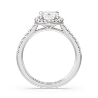A stunning choice to symbolize your promise of marriage. This diamond engagement ring features a cathedral-set diamond center stone that holds big appeal. Amplifying its captivating sparkle is a halo of round diamonds. The bands rising shoulders are also traced with diamonds for that added touch of luxury.
