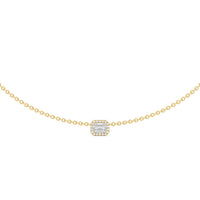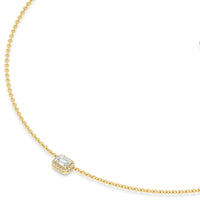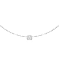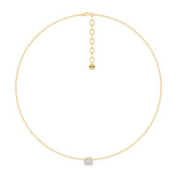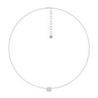A diamond chain necklace perfect for any fashion style and suitable for frequent wear. This fine piece is designed with a sleek chain holding a single pendant. The pendant bears an emerald diamond centerstone framed by an emerald-shaped halo of round diamonds. The pared-back design of this diamond necklace allows easy mixing and matching.