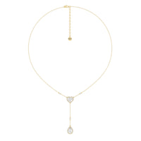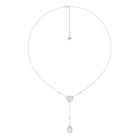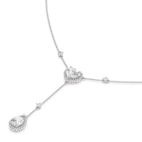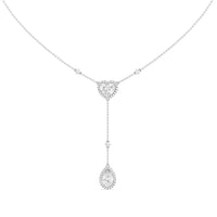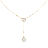 Inspired by a lariat necklace, this piece has a Y-shaped silhouette and two sparkling pendants. The chain necklace holds a heart pendant dotted at the center with a heart-cut diamond framed by a heart-shaped halo of petite round diamonds. Gently dropping from the heart pendant is a pear-cut diamond haloed by round diamonds. This necklace is a piece of everyday fine jewelry that can effortlessly enhance your daily wardrobe.