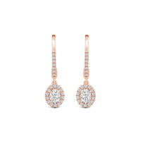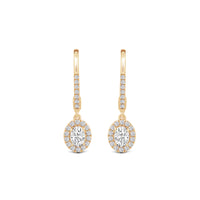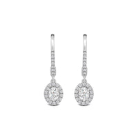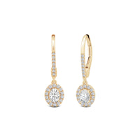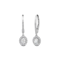 These are the earrings you need when you want to put a little more star power into your accessorizing style. These lever-back earrings feature a short row of round diamonds on their front face. A faceted oval diamond with a halo of round diamonds hangs from each lever-back earring. Expect these stunners to frame your face with fire and brilliance.