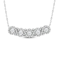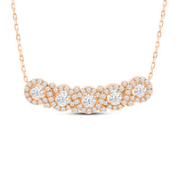 Add this necklace to your outfit for a particularly sophisticated look. This piece features five diamonds linked together by an interwoven ribbon of smaller diamonds. These ribbons also form a halo that frames each bezel-set diamond, creating a style that exudes vintage elegance.