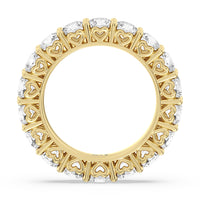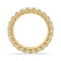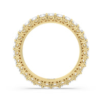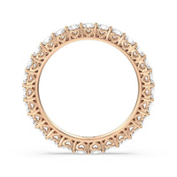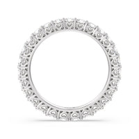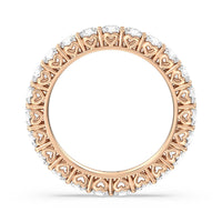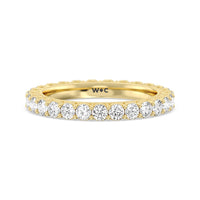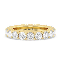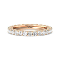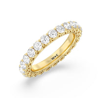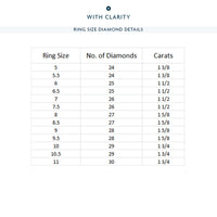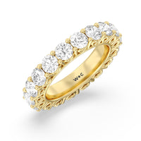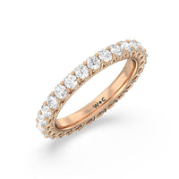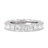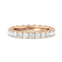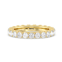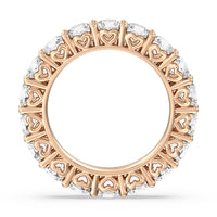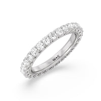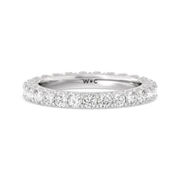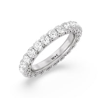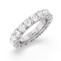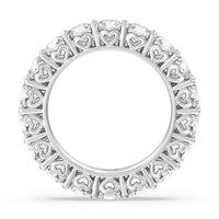 Truly symbolic of everlasting love, this eternity band features brilliant-cut round diamonds spanning the whole circumference of the ring. The glittering rocks are set on basket prongs with a decorative heart cut-out. When the ring is viewed from the side, a round frame of hearts will be seen.
