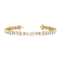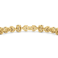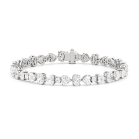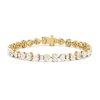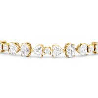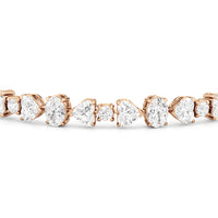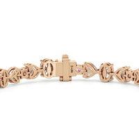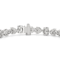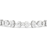 Meticulously designed tennis bracelet generously set with diamonds, this bracelet is romantic and playful. It features a pattern of graceful oval and brilliant round diamonds, supplemented by the refined charm of heart-shaped diamonds. This piece layers well with a watch, and stacked with other bracelets.