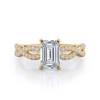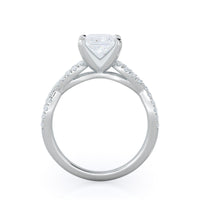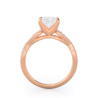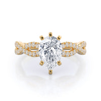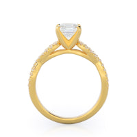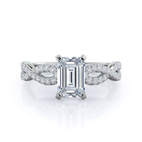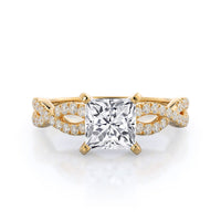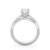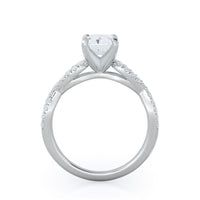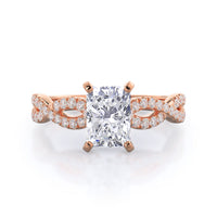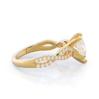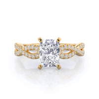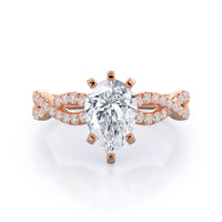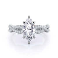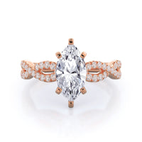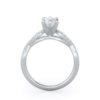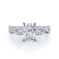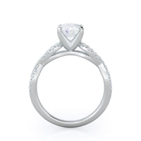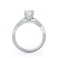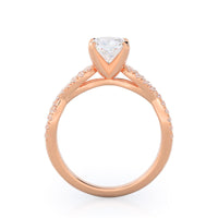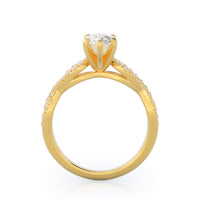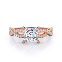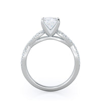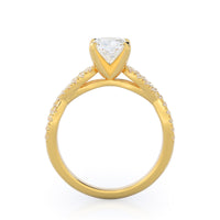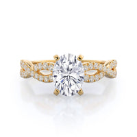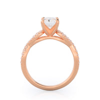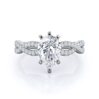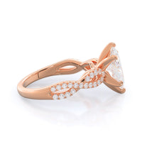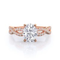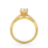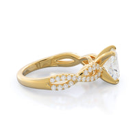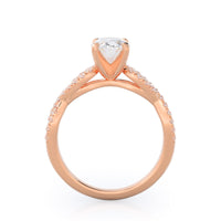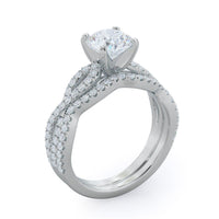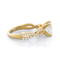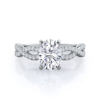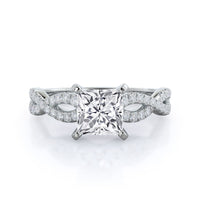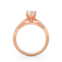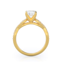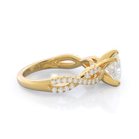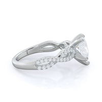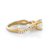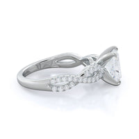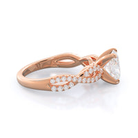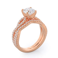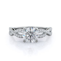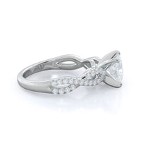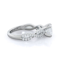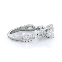 A braided pave studded accent diamond design pairs with a smooth prong design to hold the center diamond with grace.