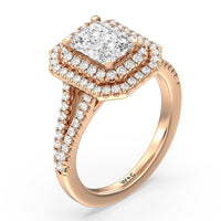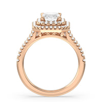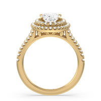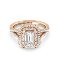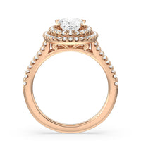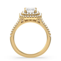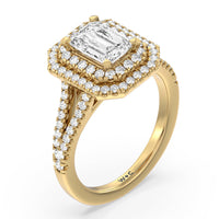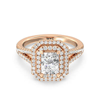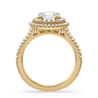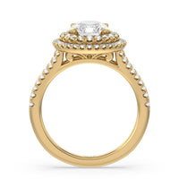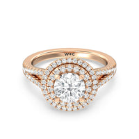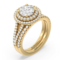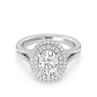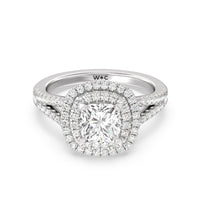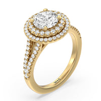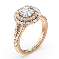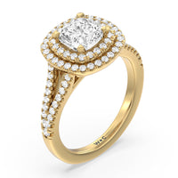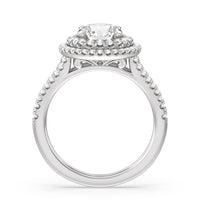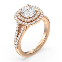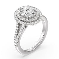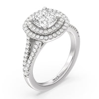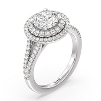 Mark your commitment to a lifelong promise of unconditional love through the never ending sparkle of this engagement ring. Its diamond center stone in an elevated cathedral setting is surrounded by two sparkling halos, while the split shank is traced with more diamonds for immeasurable brilliance.