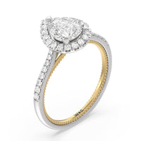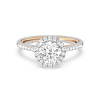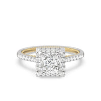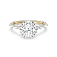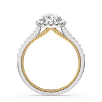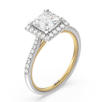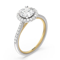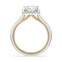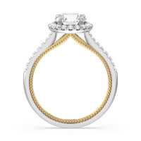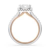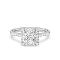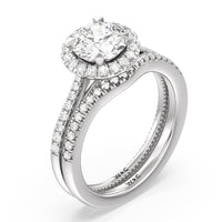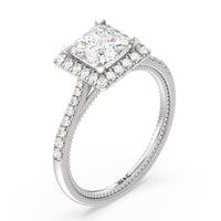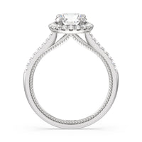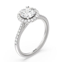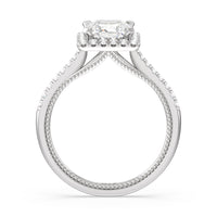It's all in the details! This ring features a secondary band incorporated into the design with delicate milgrain for a truly stunning cathedral band. A tapered pave band leads to the diamond halo to really showcase the center stone.
