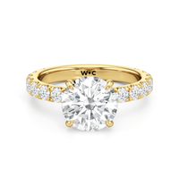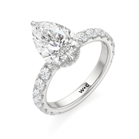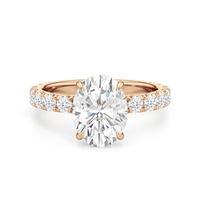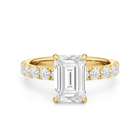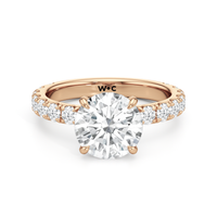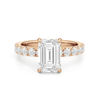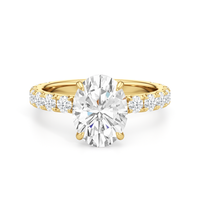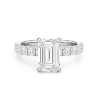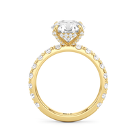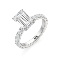Élan features a fully studded silhouette, where every detail carries an air elegance. Its straight shank echoes grace in structure, while a hidden halo adds a whisper of brilliance beneath the bold center stone. The main gem is held in a classic studded four-claw prong setting, raised with precision to display its beauty in full view.