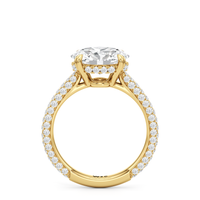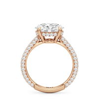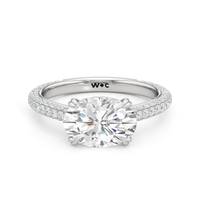 Dazzle her with the enchanting refinement of this luxury diamond engagement ring. This design showcases a center diamond securely mounted in a 4-prong double claw basket with a glittering hidden halo, ensuring brilliance from every angle. The cathedral shank's arching shoulders are adorned with a triple row of diamonds, elegantly cascading three-fourths of the way around the band. A dome pavé shank enhances the rings radiance, offering a balance of grandeur and quiet luxury. This hidden halo engagement ring defines sophistication is finished with claw prongs for a refined touch.