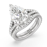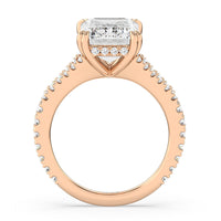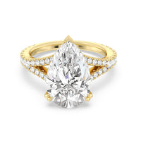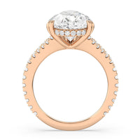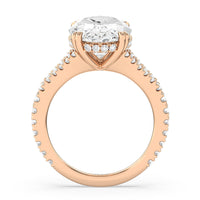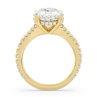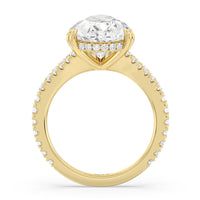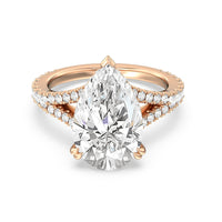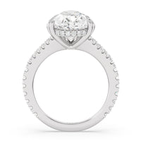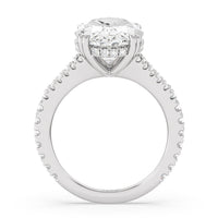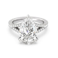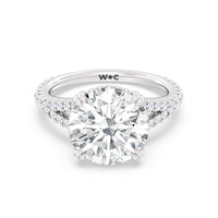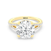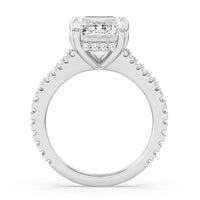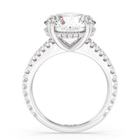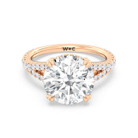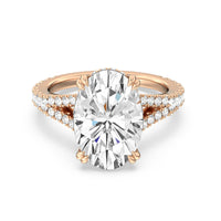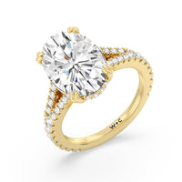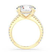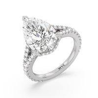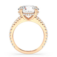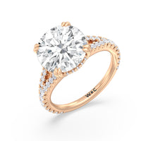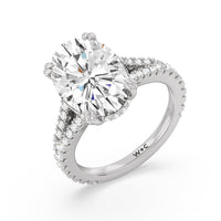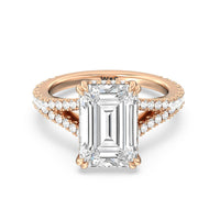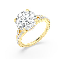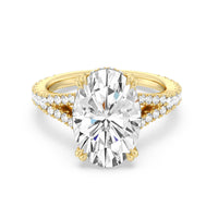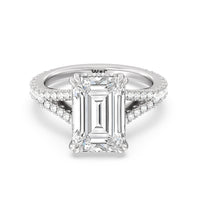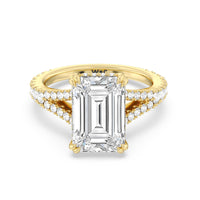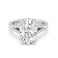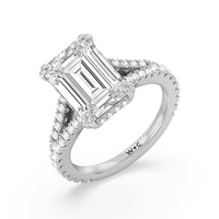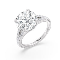 If there is a ring that defines quiet luxury succinctly, it is this diamond engagement ring. Its refined aesthetic is evident in every detail, from the stunning luxe diamond center stone to the hidden halo of petite round diamonds, adding just the right touch of brilliance. The slender split pavé shank is adorned with 3/4 diamond spread, enhancing its luminous elegance. Securing the center stone is a 4-prong double claw setting, ensuring both sophistication and stability in this split shank pave engagement ring.